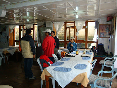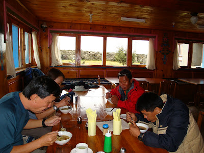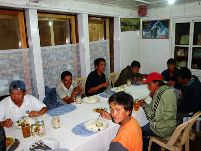 Guides and porters having their meals, the usual Dahl Baht (Lentil with rice)